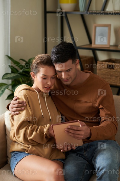 Пара, использующая цифровой планшет дома