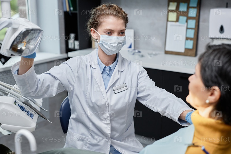Женщина в роли стоматолога, регулирующей свет и готовящейся к обследованию