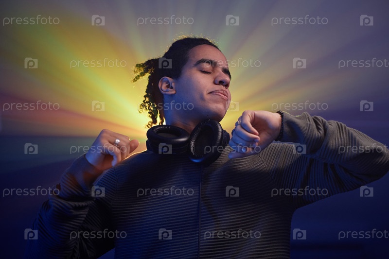 Чернокожий молодой человек танцует в светофоре 'Гало' на ретро-дискотеке