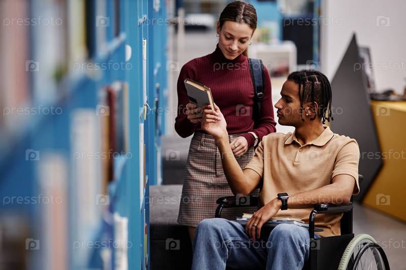 Графика улыбающейся молодой женщины, помогающей студенту-инвалиду в библиотеке