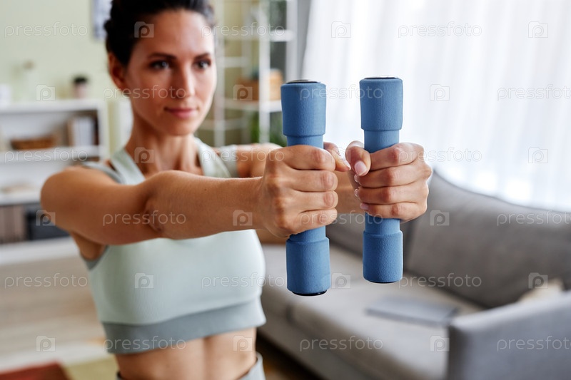 Женщина, тренирующаяся с гантеликами, наслаждается силовыми упражнениями дома