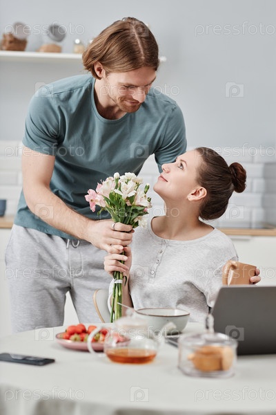 Улыбающийся молодой человек дарит цветы жене в качестве сюрприза утром