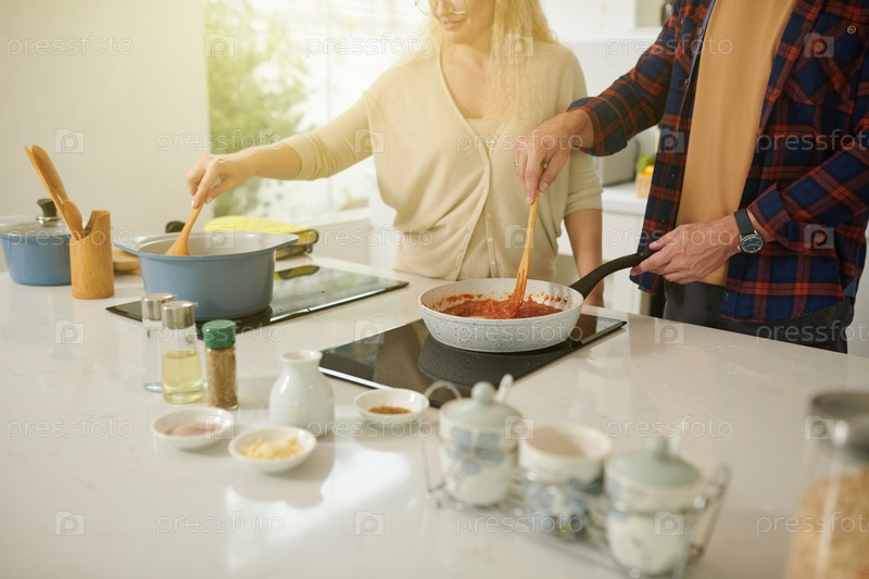 Пара готовит макароны и соус