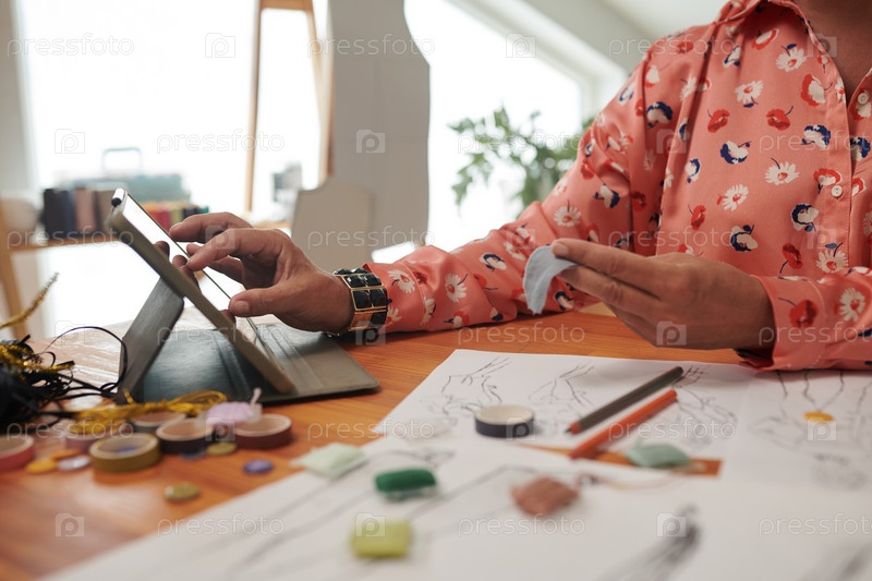 Зрелая женщина смотрит обучающее пособие на планшетном компьютере, когда занимается ремеслом дома