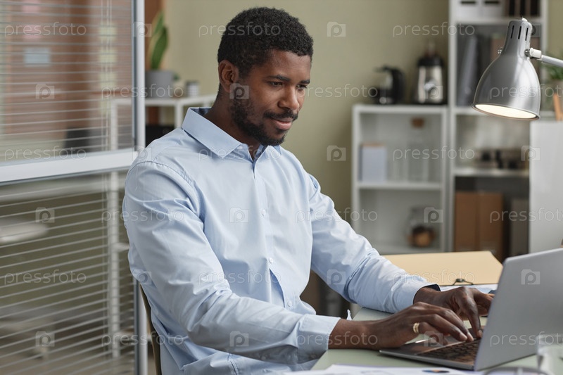 Афроамериканский бизнесмен, работающий с ноутбуком за столом
