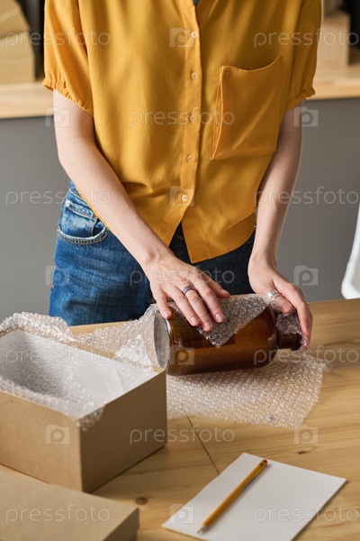 Женщина завертывает стеклянную банку в пакет