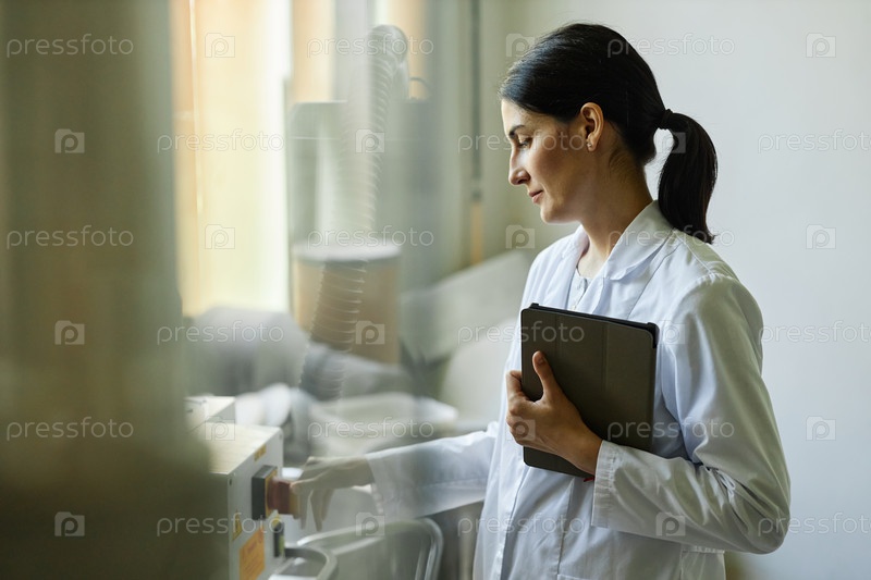 Взрослая женщина в лабораторном пальто, использующая оборудование на мастерской чистой фабрики