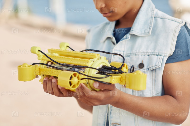 Мальчик, держащий роботизированную лодку Closeup