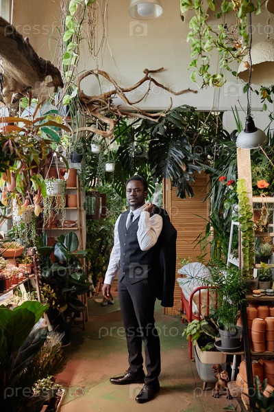 Красивый чернокожий мужчина как жених, позирующий в оранжерее с зелеными растениями