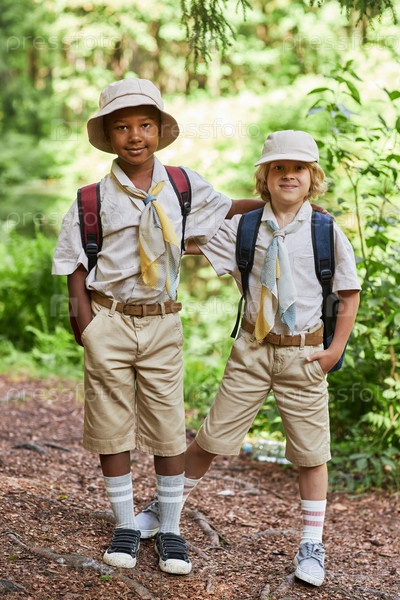 Два милых бойскаута смотрят на камеру в лесу