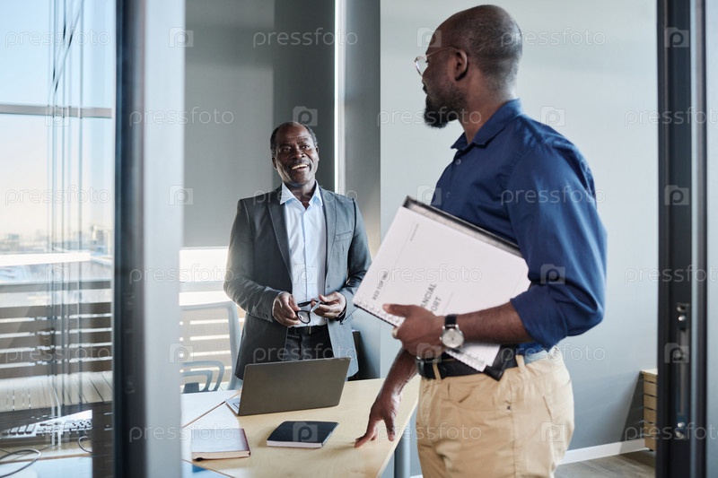 Счастливый зрелый босс смотрит на подчиненного мужчину с финансовыми документами