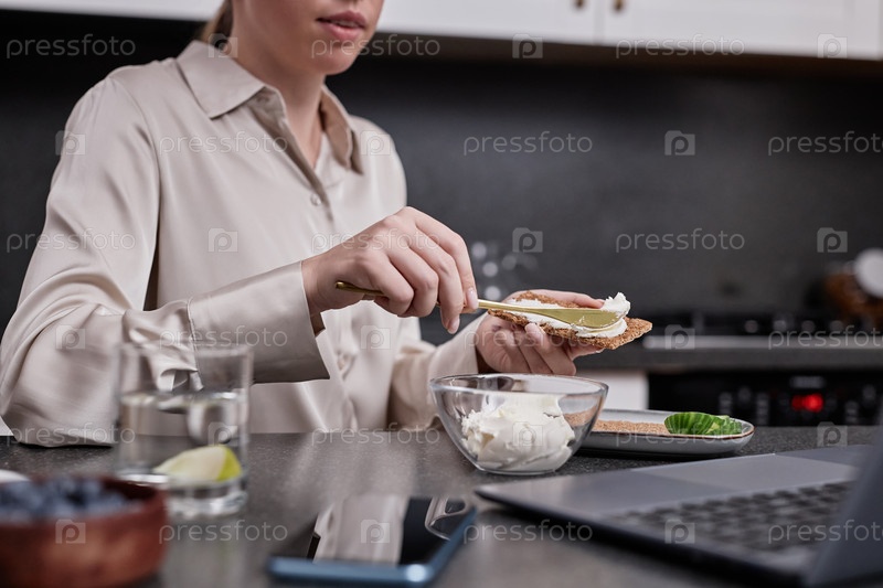 Женщина наслаждается здоровым завтраком утром и смотрит на экран ноутбука