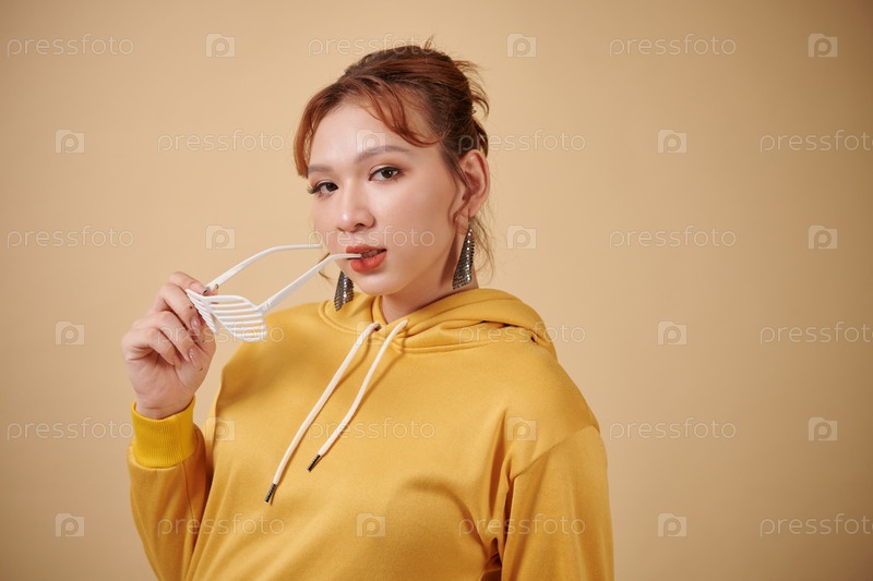 Трансгендерная женщина кусает очки Рамка