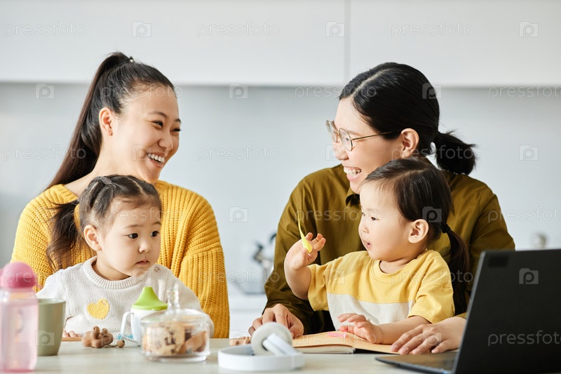 Счастливые молодые мамы, сидящие с детьми