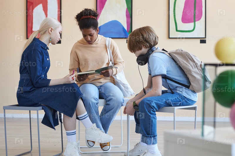 Группа из трех подростков, сидящих в кругу и выполняющих школьный проект в художественной галерее