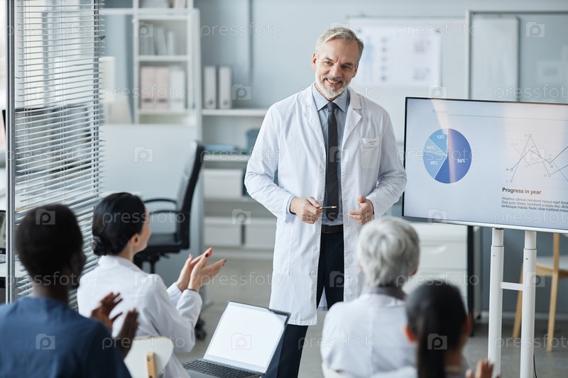 Счастливый опытный клиницист в лабораторном халате стоит перед аудиторией