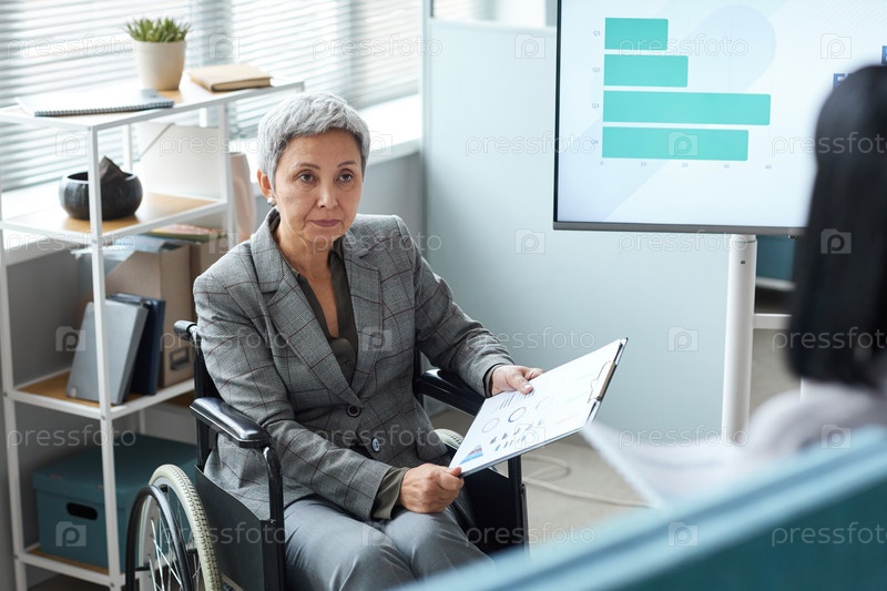 Старший босс-женщина, использующая инвалидное кресло в офисе