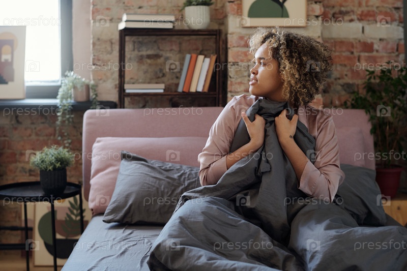 Молодая расслабленная чернокожая женщина в пижаме, покрытая серым одеялом