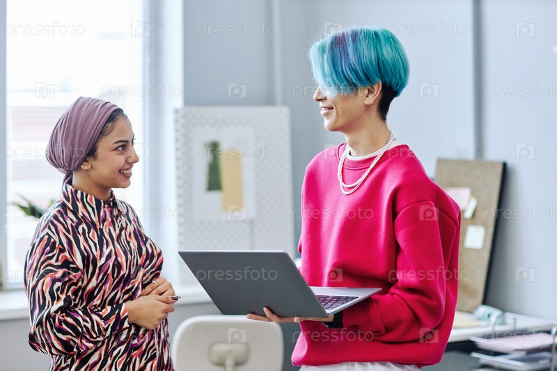 Два молодых человека Z-генерации, общающиеся стоя в офисе и держащие ноутбук