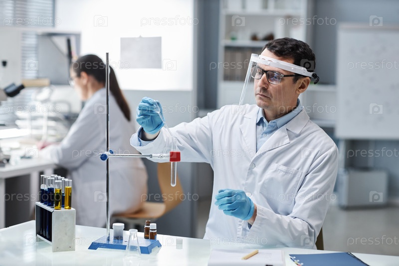 Ученый в защитном снаряжении и лицевом щите в лаборатории