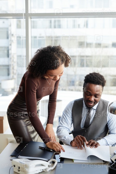 Чернокожий мужчина как босс с помощником, подписывающим документы за столом в офисе