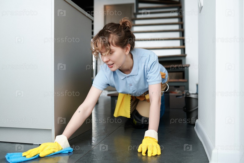 Работник службы уборки вытирает пол тряпкой