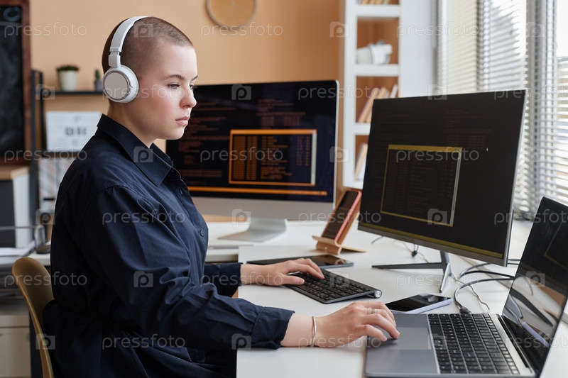 Портрет женщины-программистки в наушниках