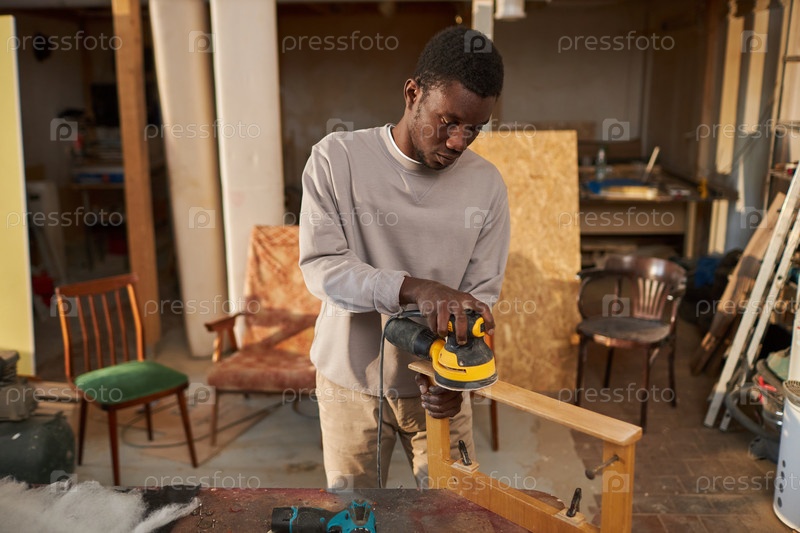 Человек строит деревянную мебель в столярной мастерской и использует инструмент для шлифования