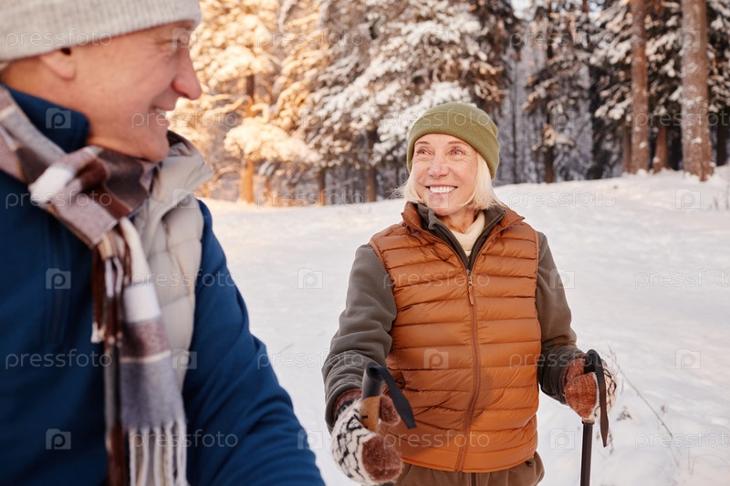 Пожилая женщина наслаждается нордической прогулкой зимой