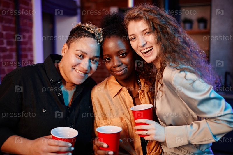 Три молодых веселых межкультурных женщины с чашками, стоящие перед камерой