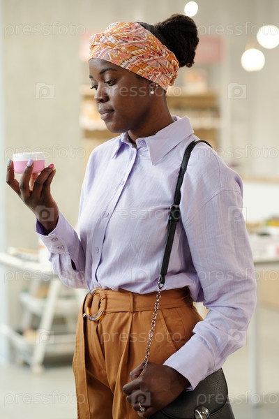 Афроамериканская девушка в умной повседневной одежде выбирает увлажняющий крем для лица