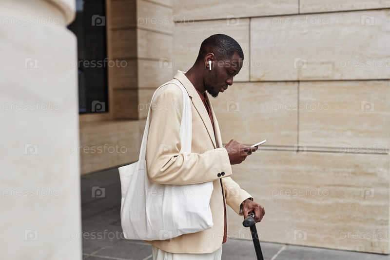 Боковой вид молодого афроамериканца в белой формальной одежде с сумочкой