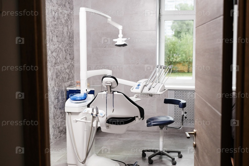 Через дверь вид на офис современного стоматолога с стоматологическим креслом