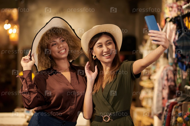 Молодые женщины делают селфи в магазине одежды