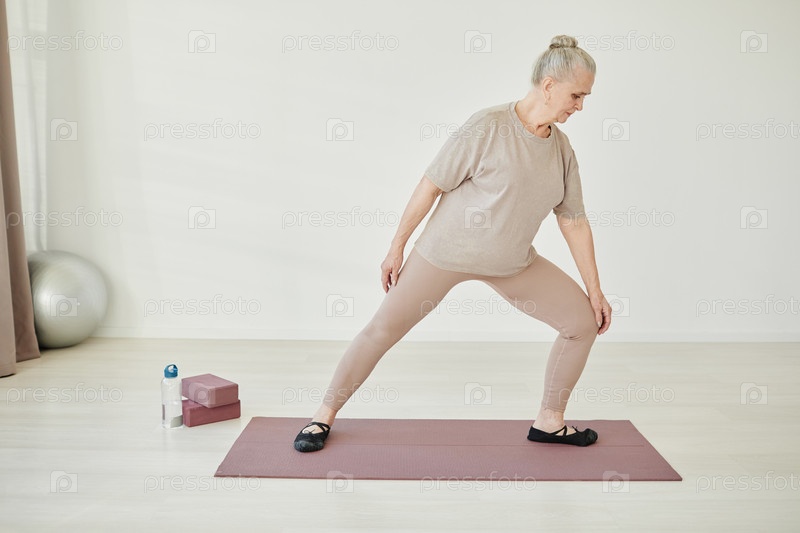 Пожилая женщина в спортивной одежде держит одну ногу согнутой в колене во время упражнений