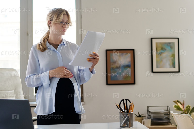 Беременная женщина работает с документами в офисе