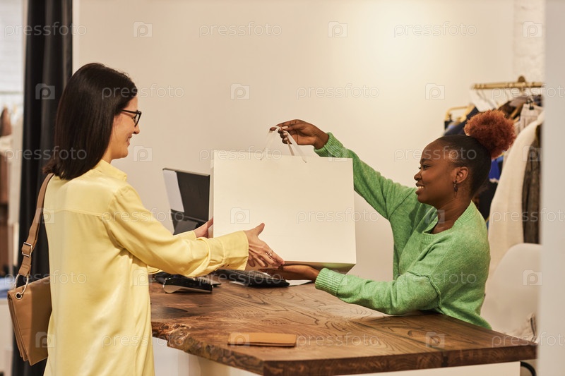 Молодой чернокожей женщины, дающей сумку клиенту в магазине одежды