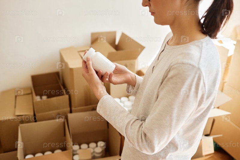 Молодая женщина держит пустую бутылку с таблетками, упаковывающую лекарство