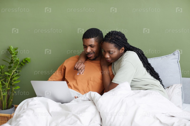 Молодая пара использует ноутбук в спальне