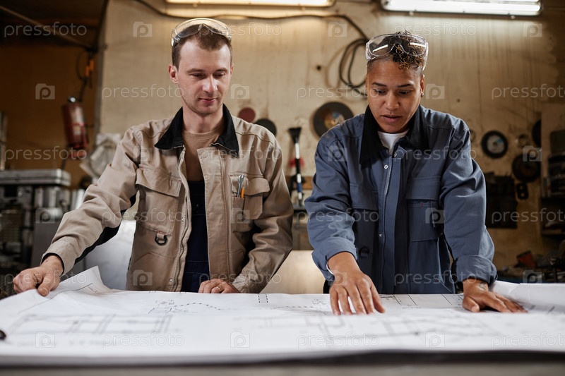 Два рабочего беседуют на фабрике