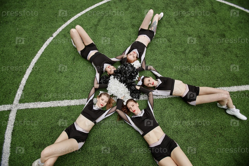 Чирлидинг-девочки с помпоном позируют на траве