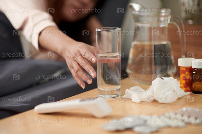 Больная женщина берет стакан воды