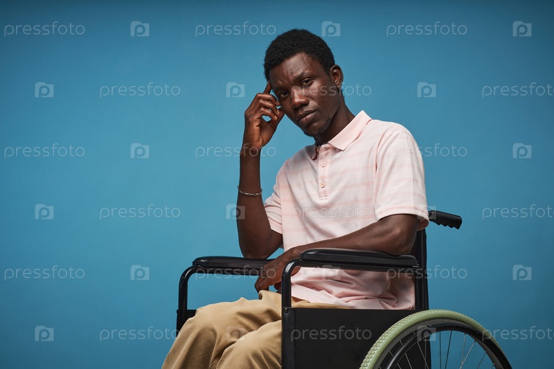 Чернокожий мужчина с ограниченными возможностями, использующий инвалидное кресло на синем фоне
