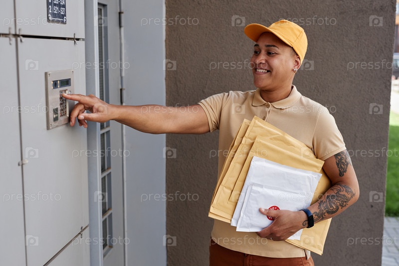 Женщина-работница по доставке звонит в колокол