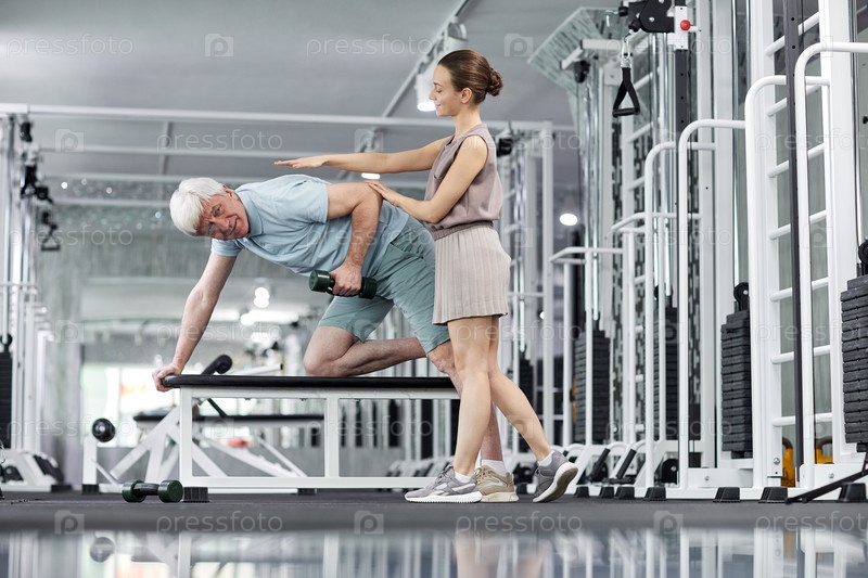 Женская фитнес-тренера с клиентом Senor в тренажерном зале