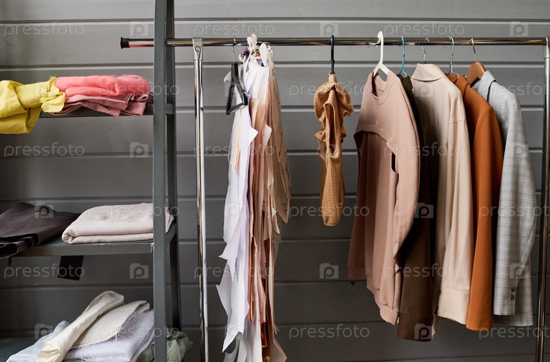 Часть длинной стойки с разнообразной повседневной одеждой разных цветов в мастерской
