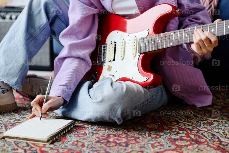 Музыкант с гитарой пишет новую песню