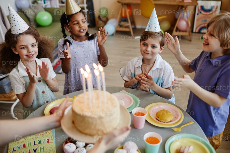 Разнообразная группа счастливых детей, ожидающих торта со свечами