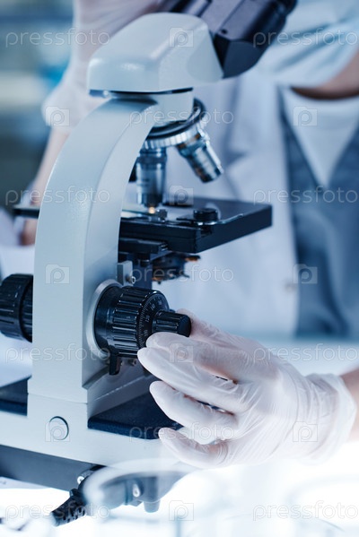Ученый использует микроскоп в лаборатории
