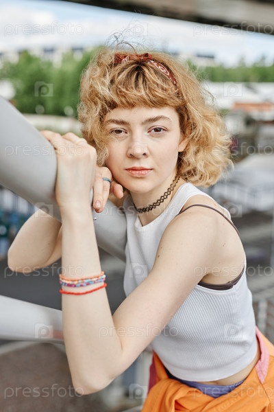 Открытый портрет молодой женщины с кудрявыми волосами на открытом воздухе